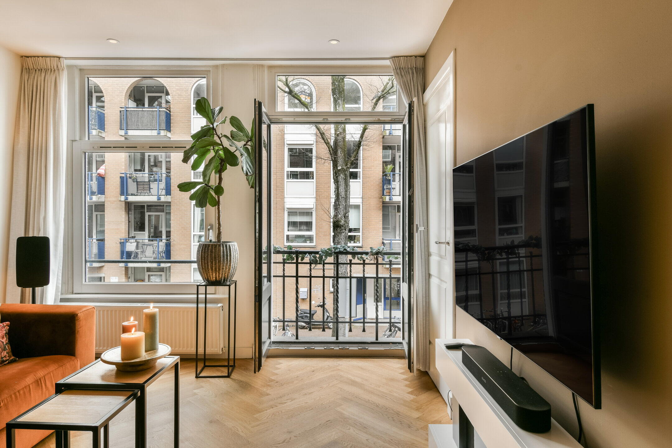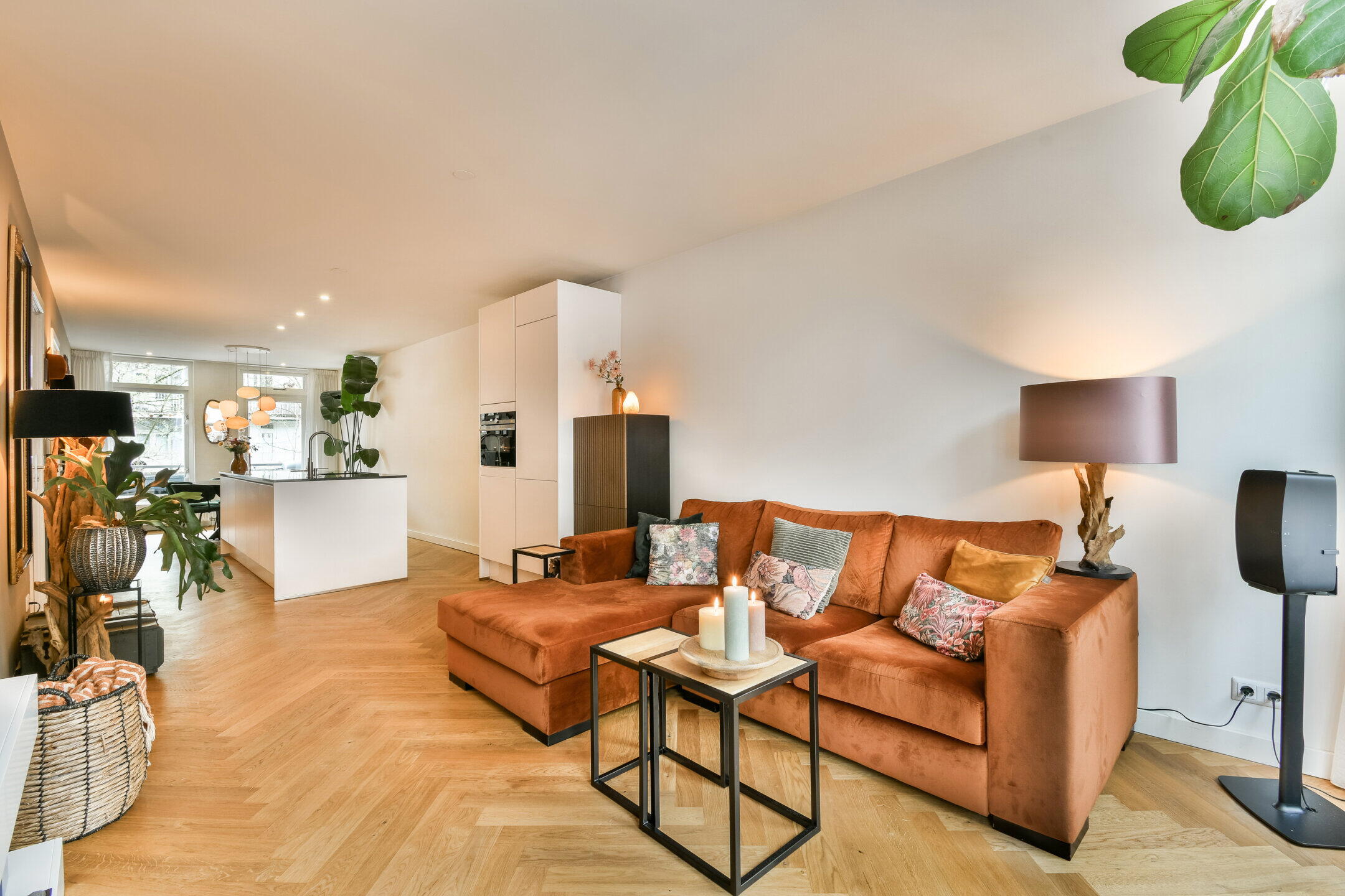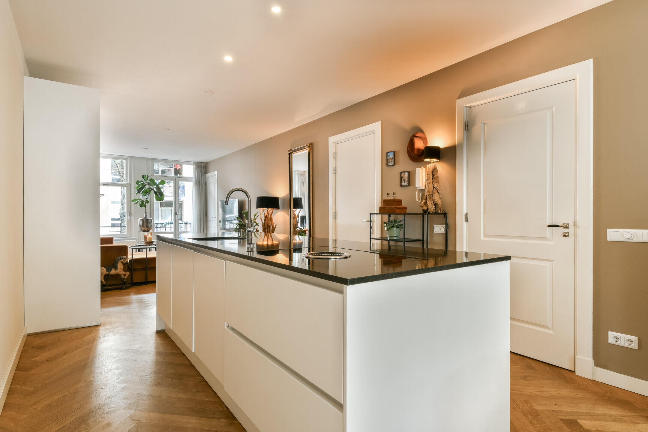 Entrance hall. Cosy, spacious living room with an open-plan kitchen in the center, fitted with various luxury built-in appliances, including a built-in washing machine. At the front, French doors lead onto a French balcony. There is also a bedroom at the front. At the rear is a bathroom, fitted with a walk-in shower, washbasin, toilet and towel radiator. This room is also used as a storage room or could be used as a home office. Beautiful herringbone parquet flooring runs throughout the entire flat.