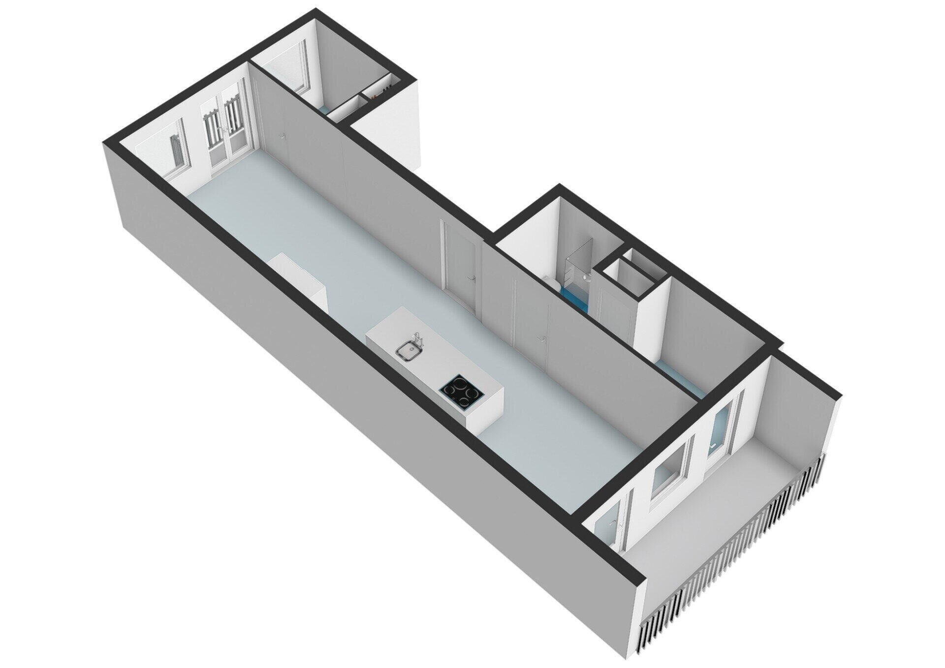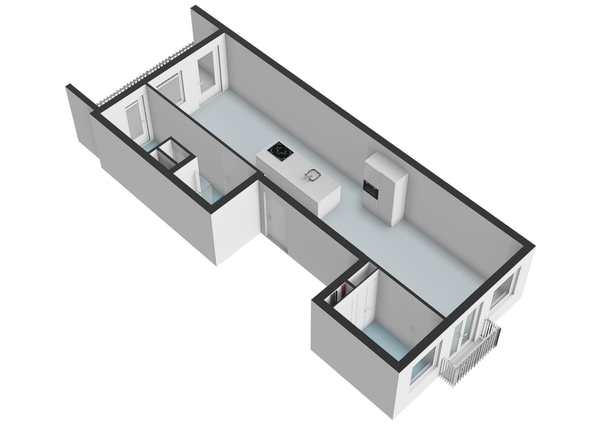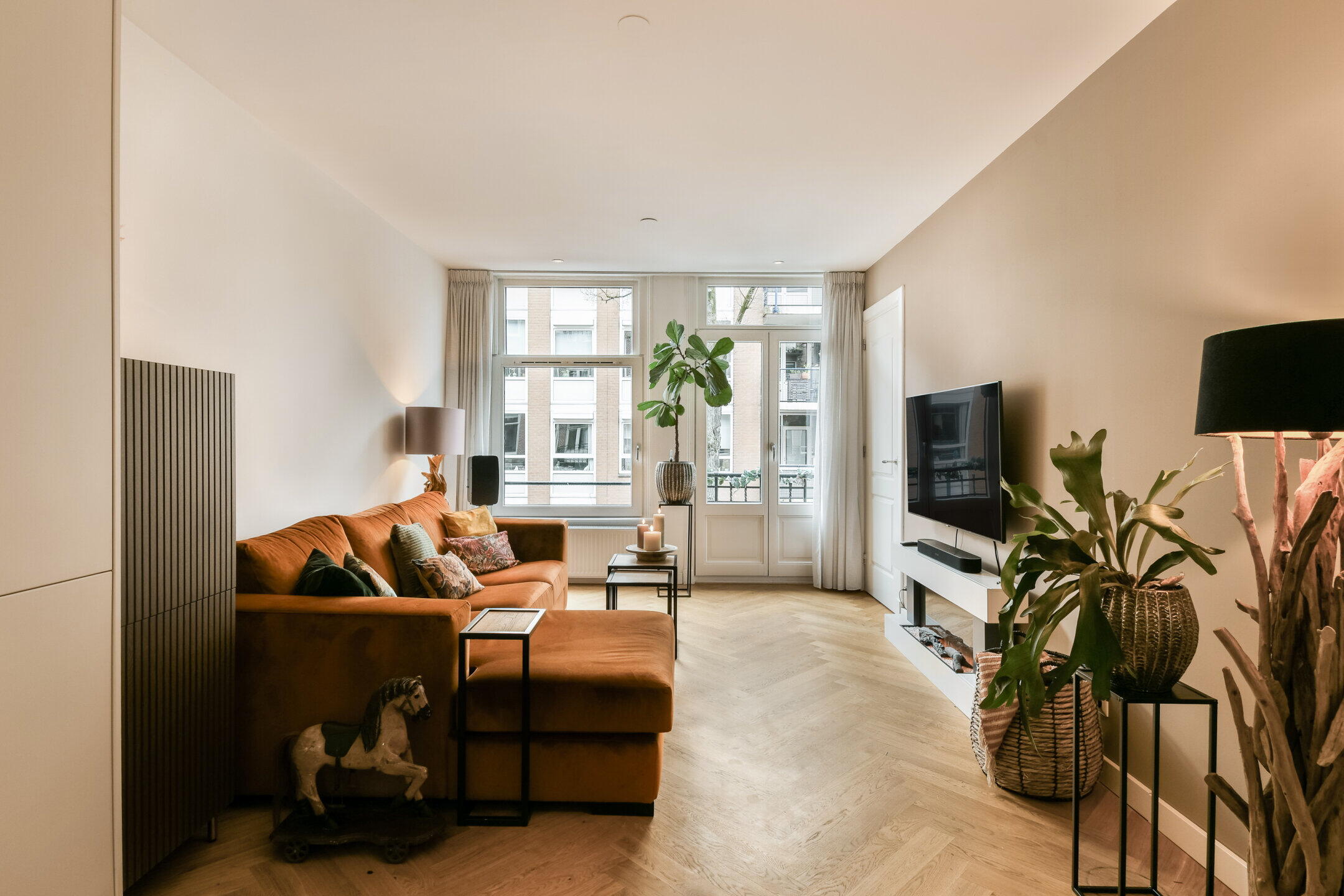Entrance hall. Cosy, spacious living room with an open-plan kitchen in the center, fitted with various luxury built-in appliances, including a built-in washing machine. At the front, French doors lead onto a French balcony. There is also a bedroom at the front. At the rear is a bathroom, fitted with a walk-in shower, washbasin, toilet and towel radiator. This room is also used as a storage room or could be used as a home office. Beautiful herringbone parquet flooring runs throughout the entire flat.