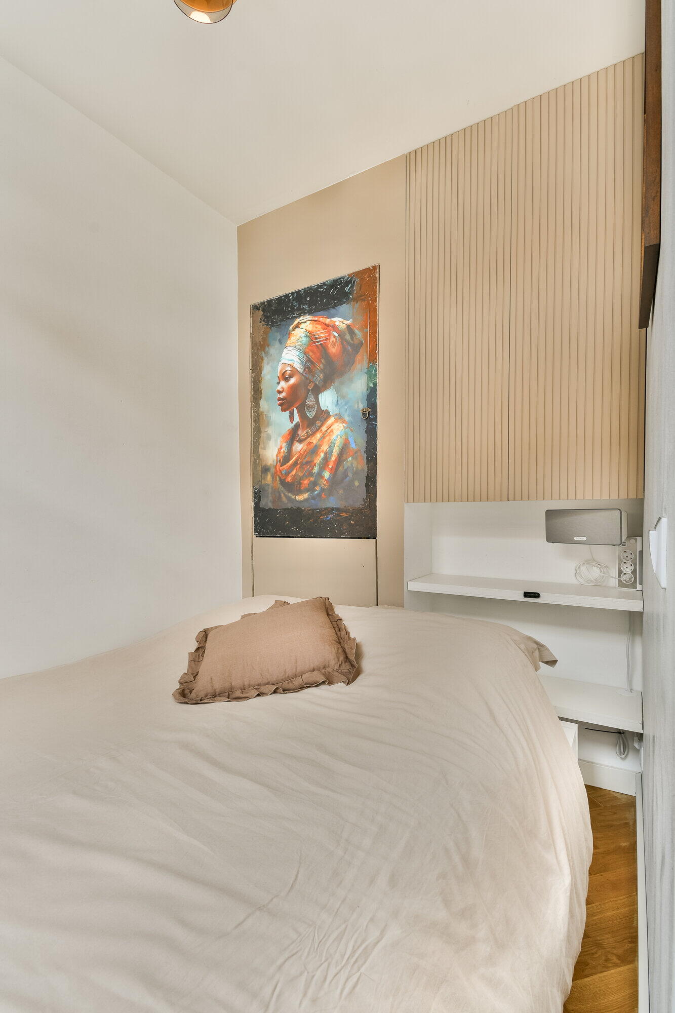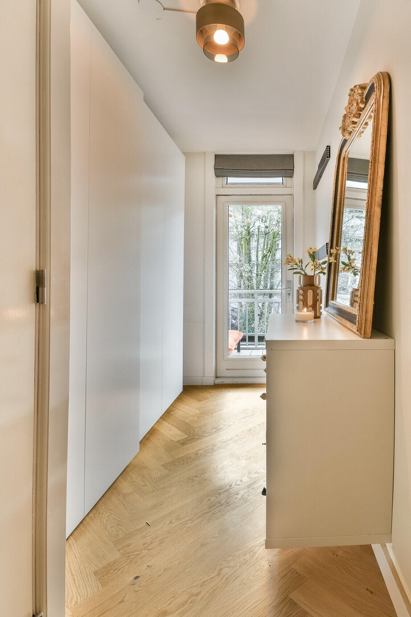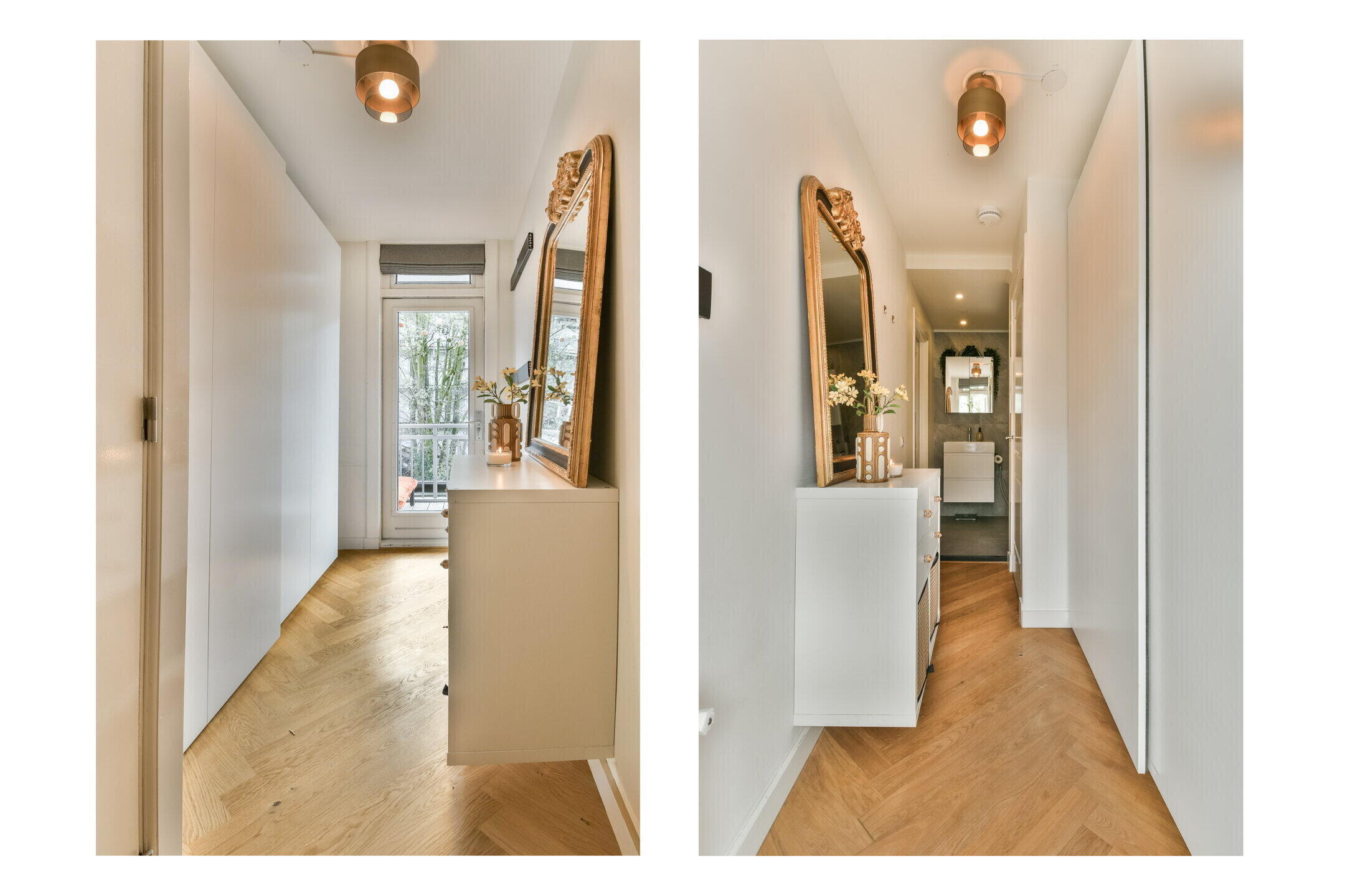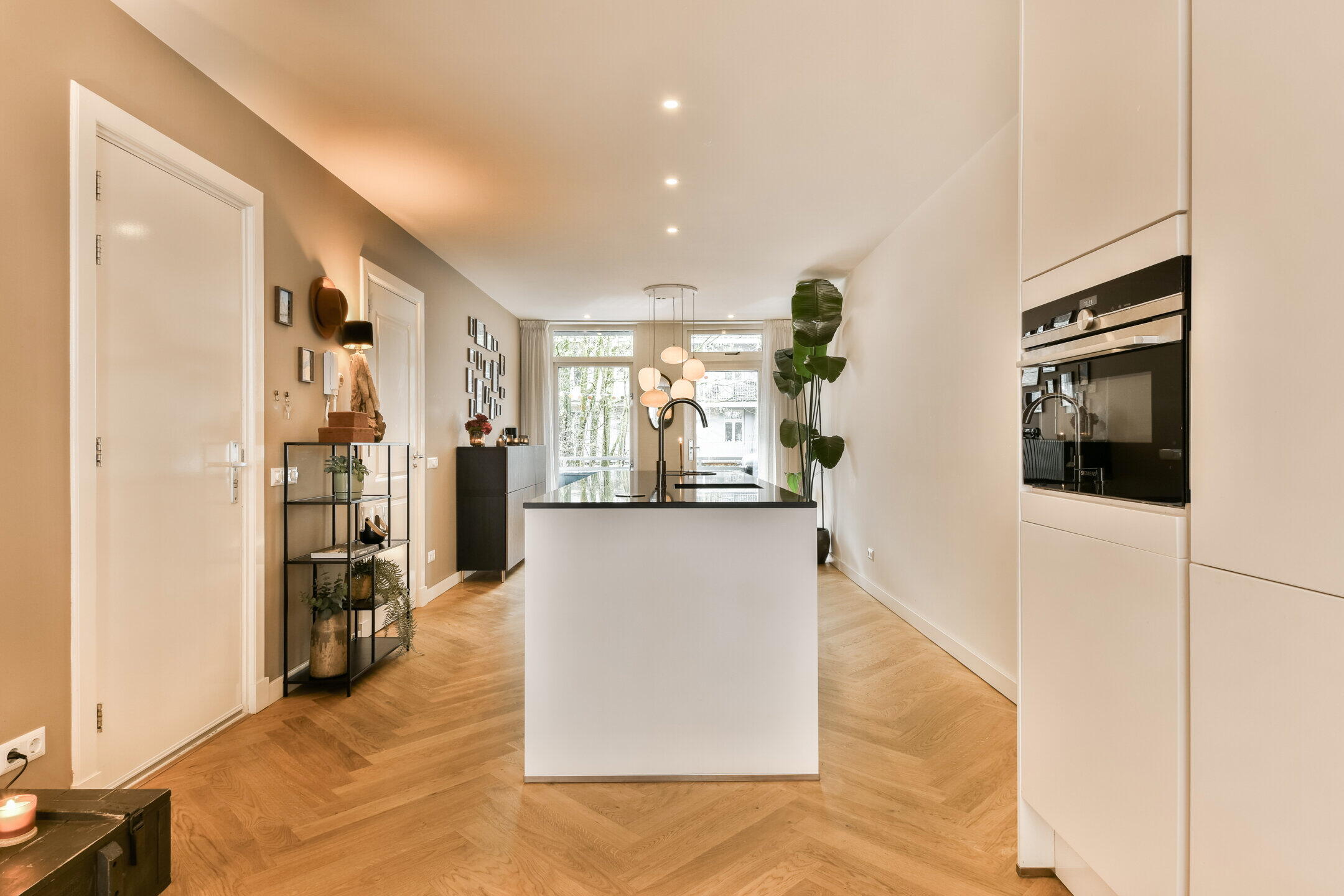 - Herringbone parquet flooring throughout the apartment.